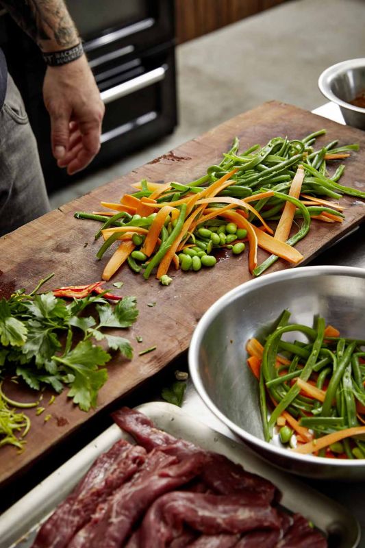 - Für Salat Möhren mit Sparschäler oder Hobel in dünne, feine breite Streifen schneiden. Grüne Bohnen putzen und mit Edamame in kochendem Salzwasser ca. 4 Minuten lang garen. Abgießen, kalt abschrecken und abtropfen lassen.