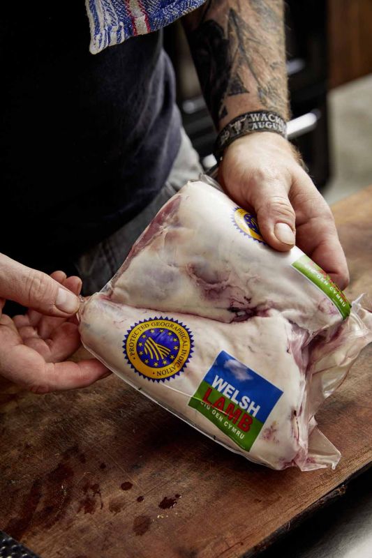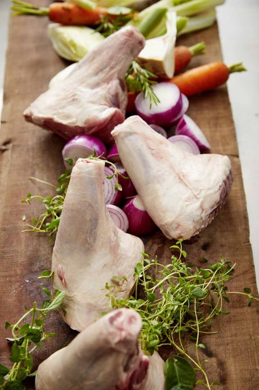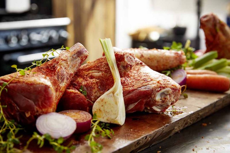- Haxen vom Walisischen Lamm trocken tupfen und mit Mischung aus Paprikapulver, 1 Teelöffel Meersalz und 3 Esslöffeln Olivenöl einreiben.