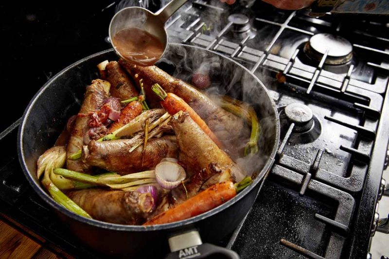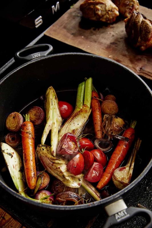 - In Bräter 4 Esslöffel Olivenöl erhitzen und marinierte Haxen darin rundherum kräftig anbraten. Grob geschnittenes Gemüse, Lorbeerblätter, alle Rosmarinzweige und 3 Thymianstiele zugeben und mitbraten. Wein, Lammfond und Zucker verrühren und Flüssigkeit über Haxen gießen. In vorgeheiztem Backofen ca. 2 Stunden schmoren.